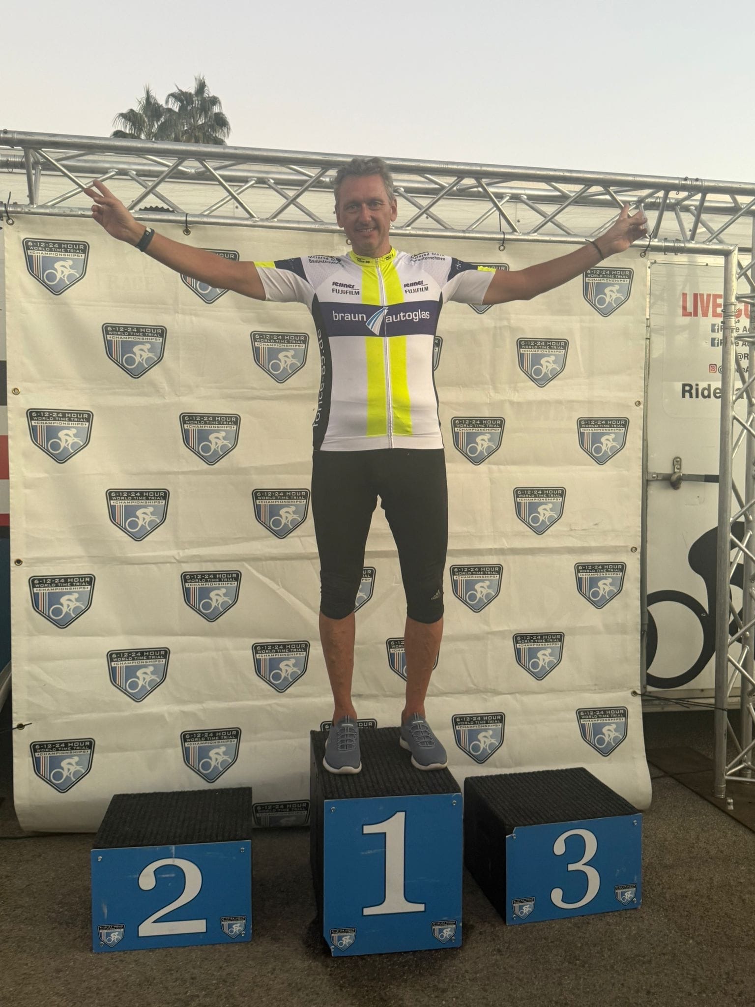 Die Nacht geht .... endlich.... Es ist 7 Uhr als die Sonne aufgeht. Es dauert nicht lange und die Wärme kommt zurück. Ich mache dann meinen einzigen längeren Stop. Ich ziehe mich in 5 min. einmal komplett um. Es sind noch 9 Stunden. Es wird schon zäh. Immer wieder die gleiche Strecke. Die gleichen Kurven und und und. Um mir die Zeit zu vertreiben zähle ich die Restzeit zusammen und rechne mir die noch zu fahrenden Runden aus. Dann zähle ich Sie Rückwärts. Währendessen wird es immer heißer, drückender und vorallem sehr trocken. Innerhalb weniger Stunden werden die Lippen trocken und reißen. Ich kann auch nicht mehr 100% tief einatmen. Der Sand und Staub legt sich in die Lungen ab. Um 14.30 Uhr fahre ich in meine letzte große Runde. Ich verabschiede mich von jeder Kurve. Der Radcomputer ploppt auf. Die 700km sind geschafft. Yeees. Bei der letzten Verpflegung hat man mir mit auf den Weg gegeben. Dein Vorsprung ist 20 Meilen. Und dann kommt das was man weder will noch braucht. Der Hinterreifen verliert sehr schnell Luft. Ein Platten nach 22 Std. Mein erster Gedanke. Sch.... Egal ich kann einmal wechseln. Jetzt muss es nur gut gehen und aufs erste Mal klappen. Wichtig ist dabei einen klaren Kopf zu behalten. Nicht zu schnell machen. Keinen Fehler und vorallem die Frage stellen. Warum habe ich diesen Platten überhaupt bekommen. Ich kontrolliere also zusätzlich gründlich den Mantel. Es könnte ja ein Splitter oder Stachel festhängen. Es dauert 10 min. bis alles geklappt hat und ich wieder weiterfahren kann. Der Reifen hält bis zum Schluss. Doch ich habe Zeit verloren. Der Plan genau 90 min vor Ende auf die kleine, 8km Schleife zu kommen ist nicht mehr realisierbar. Ich versuche es zwar noch Zeit aufzuholen aber es klappt nicht. So schaffe ich in der verbleibenden Zeit (nur) 5 Runden à 8km. 10 min vor Ablauf komme ich durchs Ziel. Noch eine Runde zu fahren macht keinen Sinn. Ich schaffe es nicht mehr pünklich. Ich fahre zu meiner Mama und den anderen Deutschen Supportern. Ich bin froh und erschöpft. Ich gebe irgendjemanden mein Rad in die Hände, umarme meine Mama und lege mich auf den Boden. Nach 5 min Frage ich wie es denn jetzt in meiner Alterklasse ausgegangen ist. Alle Deutschen hatten seit 2 Stunden keine brauchbare Internetverbindung mehr. Ergebnis unbekannt. Ein Gedankenkarusell beginnt. Hat der Platten evtl. zuviel Zeit gekostet? Ich kann mich nicht wirklich freuen. Ich frage einen Amerikanischen Betreuer ob er bitte nachschauen kann wie das Ergebnis in der Alterklasse 50-59 Jahre ausgegangen ist. Recht schnell bekomme ich eine Antwort.