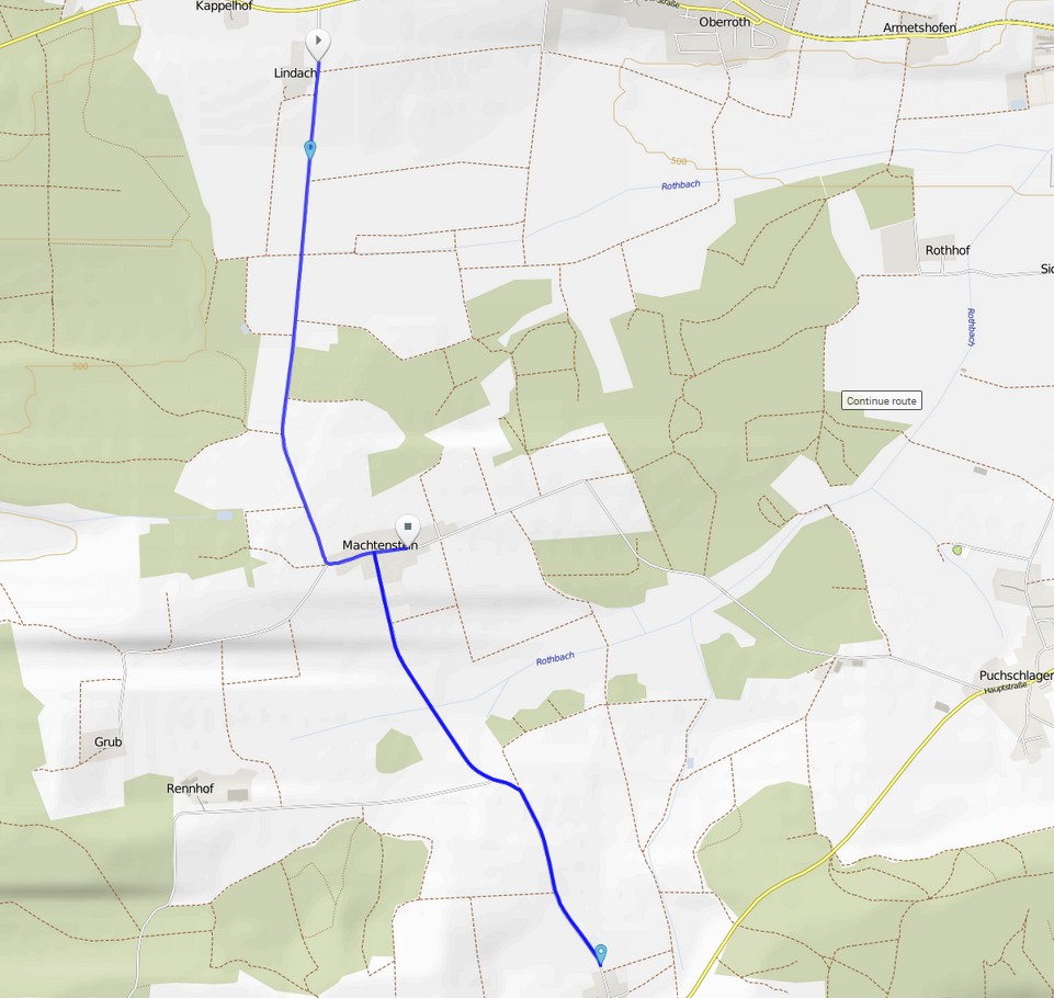 Start ist in Machtenstein. Von Machtenstein geht es Richtung Lindach. 200m nach dem Start folgt eine 90° Rechtskurve, danach geht es ca 2km bis nach Lindach wo mit einer 180° Wende gedreht wird und es geht zurück nach Machtenstein. In Machtenstein geht es zunächst 90° Links und nach 200m ein einer 90°-Kurve rechts Richtung Kreuzholzhausen.